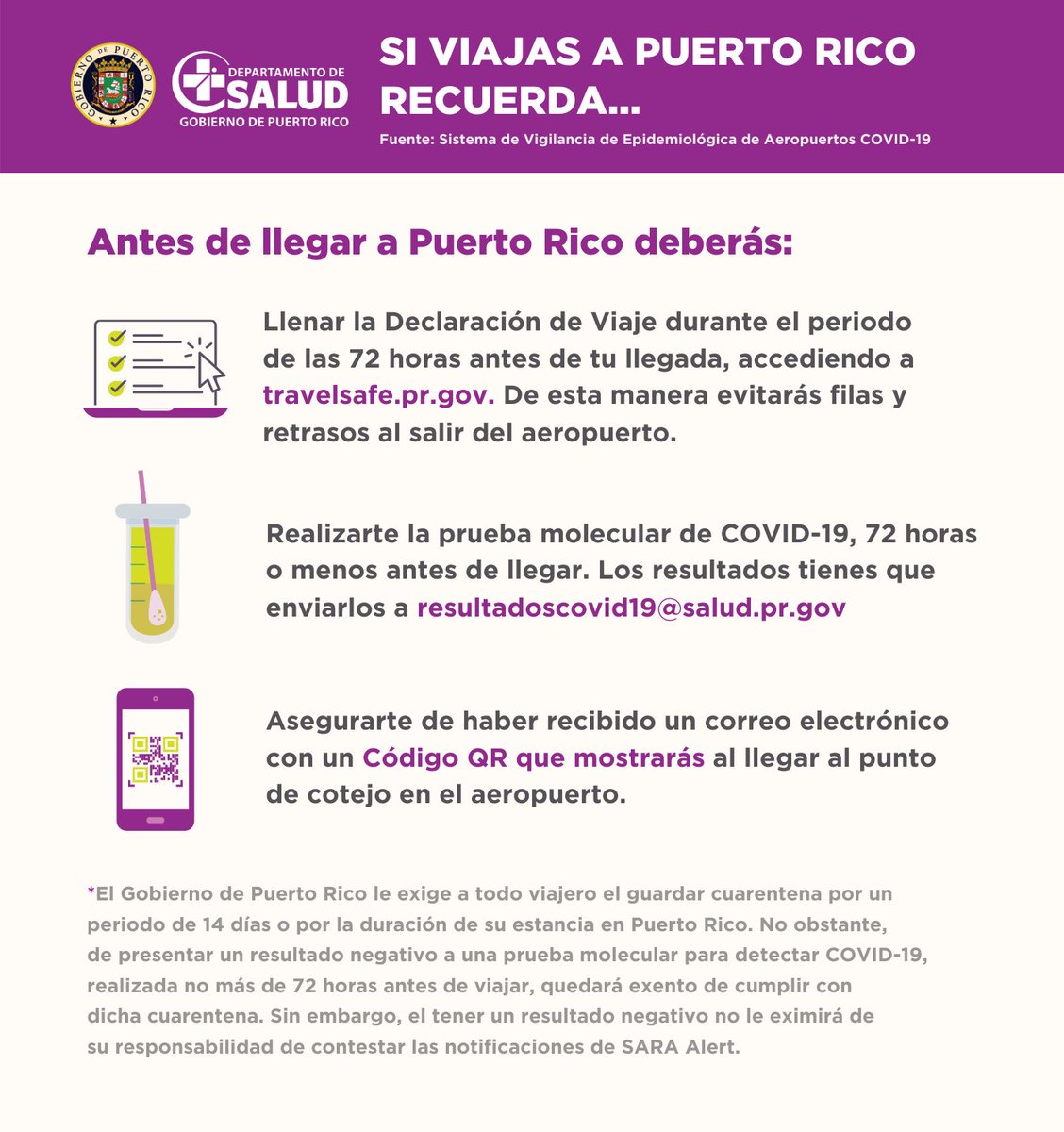 Canal de You Tube Oficial del Departamento de Salud del Estado Libre Asociado de Puerto Rico. Si tu país no está en el mapa consulta el apartado Viajas a España. Official information from the Government of Puerto Rico on surveillance guides mandates and notices applicable to any person traveling to Puerto Rico.